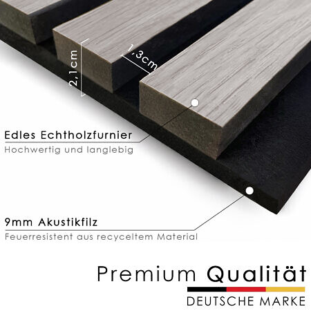 Die hochwertigen Paneele bestehen aus einer MDF-Trägerplatte, schallabsorbierendem Filz und einem dreiseitigen Furnier aus echter Eiche – ein klarer Vorteil gegenüber vielen herkömmlichen Produkten mit nur einseitigem Dekor. Die warme Holzoptik schafft eine einladende Atmosphäre und ist in fünf modernen Farbtönen erhältlich.