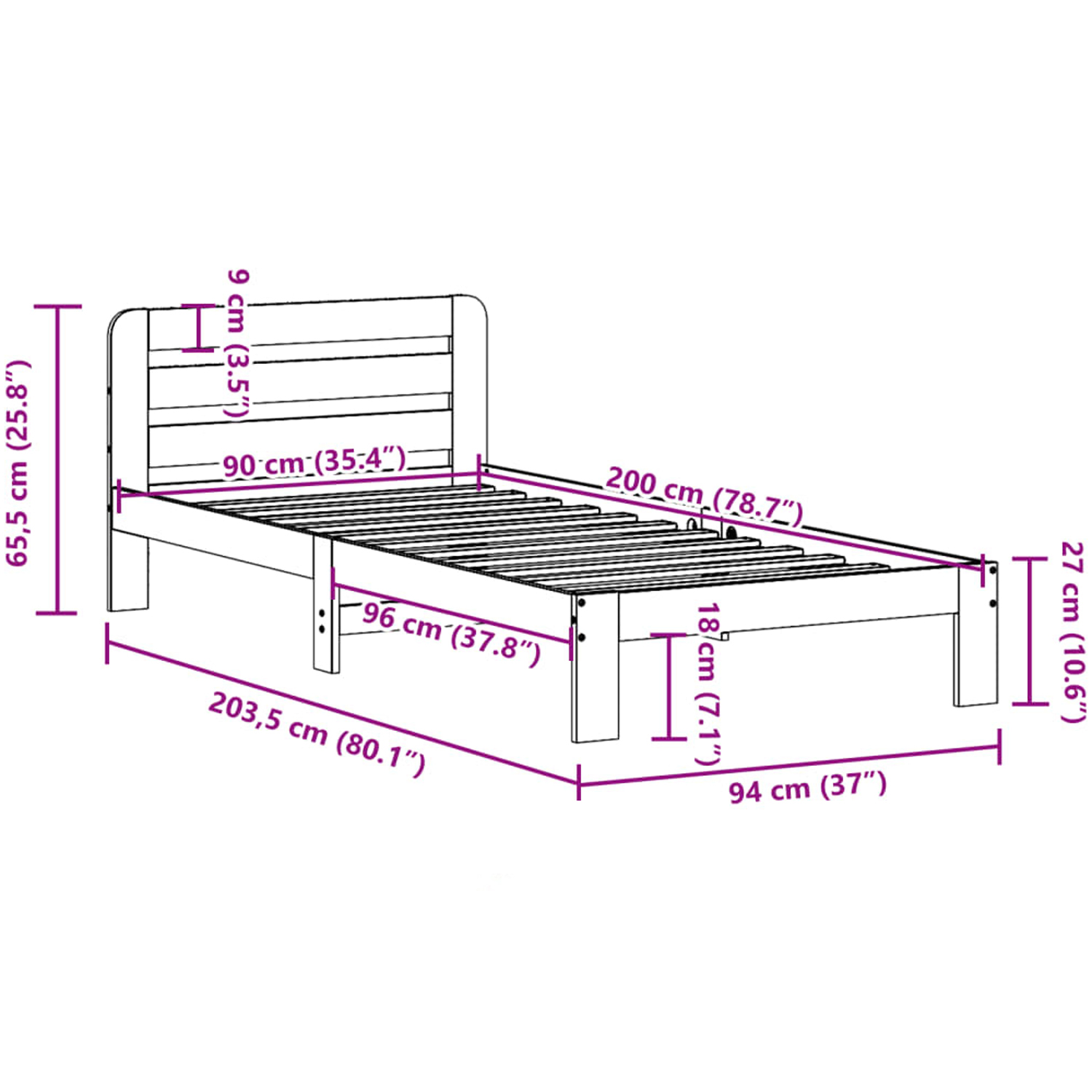 - Abmessungen Bettrahmen: 203,5 x 94 x 65,5cm (Länge x Breite x Höhe)