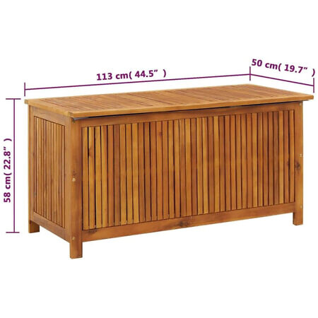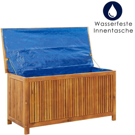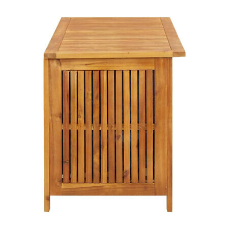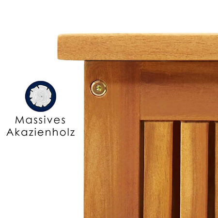 Die Garten-Aufbewahrungsbox besteht aus massivem Akazienholz, einem Hartholz mit dichter Maserung. Diese wunderschön gestaltete Outdoor-Box ist stabil, langlebig und ein echter Blickfang. Darüber hinaus machen die exquisite Verarbeitung und die natürliche Holzmaserung jedes Stück zu einem Unikat.