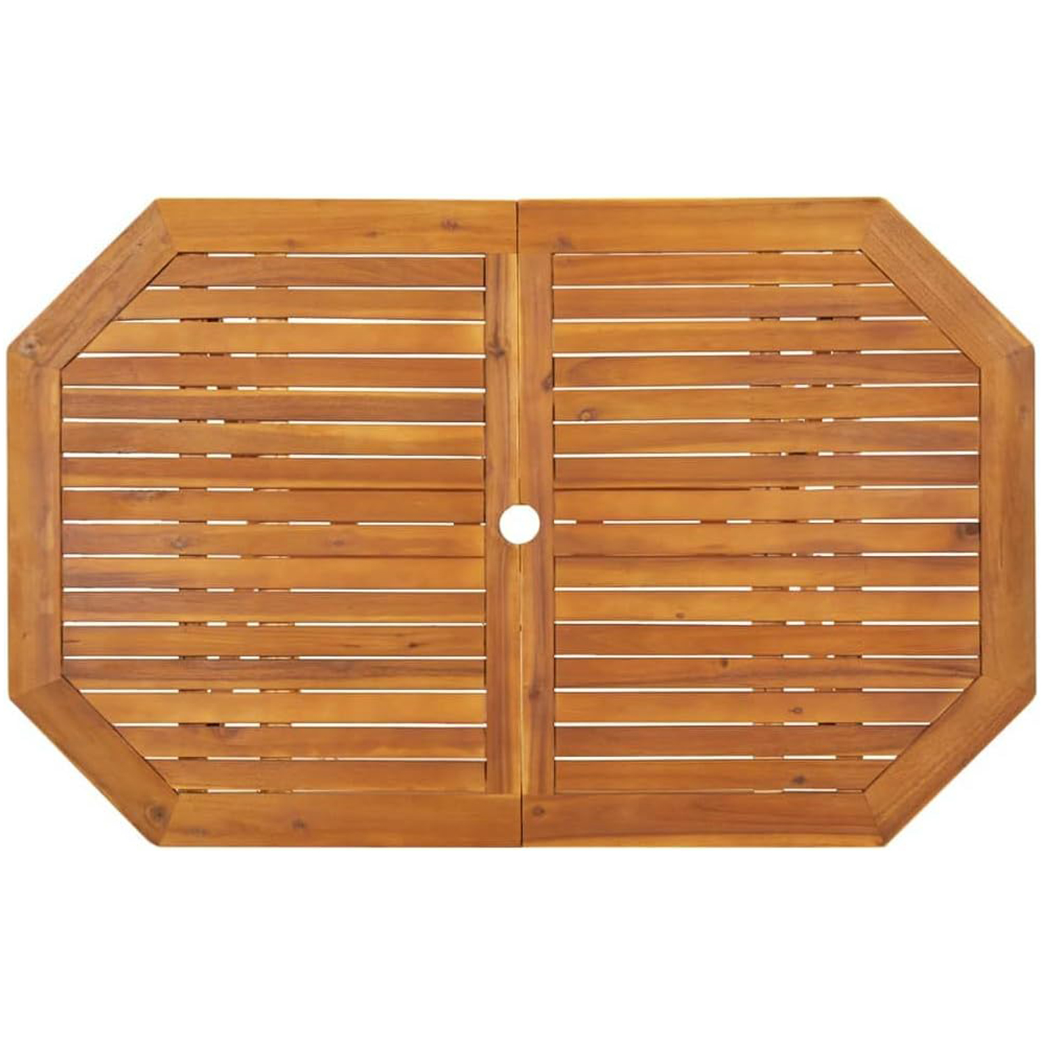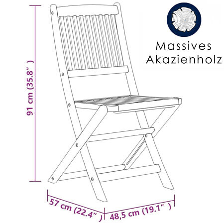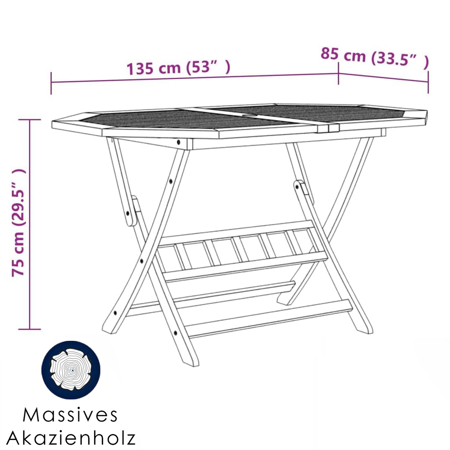 Das Set besteht aus einem großzügigen Esstisch und sechs bequemen Klappstühlen, allesamt gefertigt aus massivem, geöltem Akazienholz. Das tropische Hartholz überzeugt durch seine Langlebigkeit, Wetterbeständigkeit und pflegeleichte Oberfläche – ideal für den Outdoor-Einsatz.